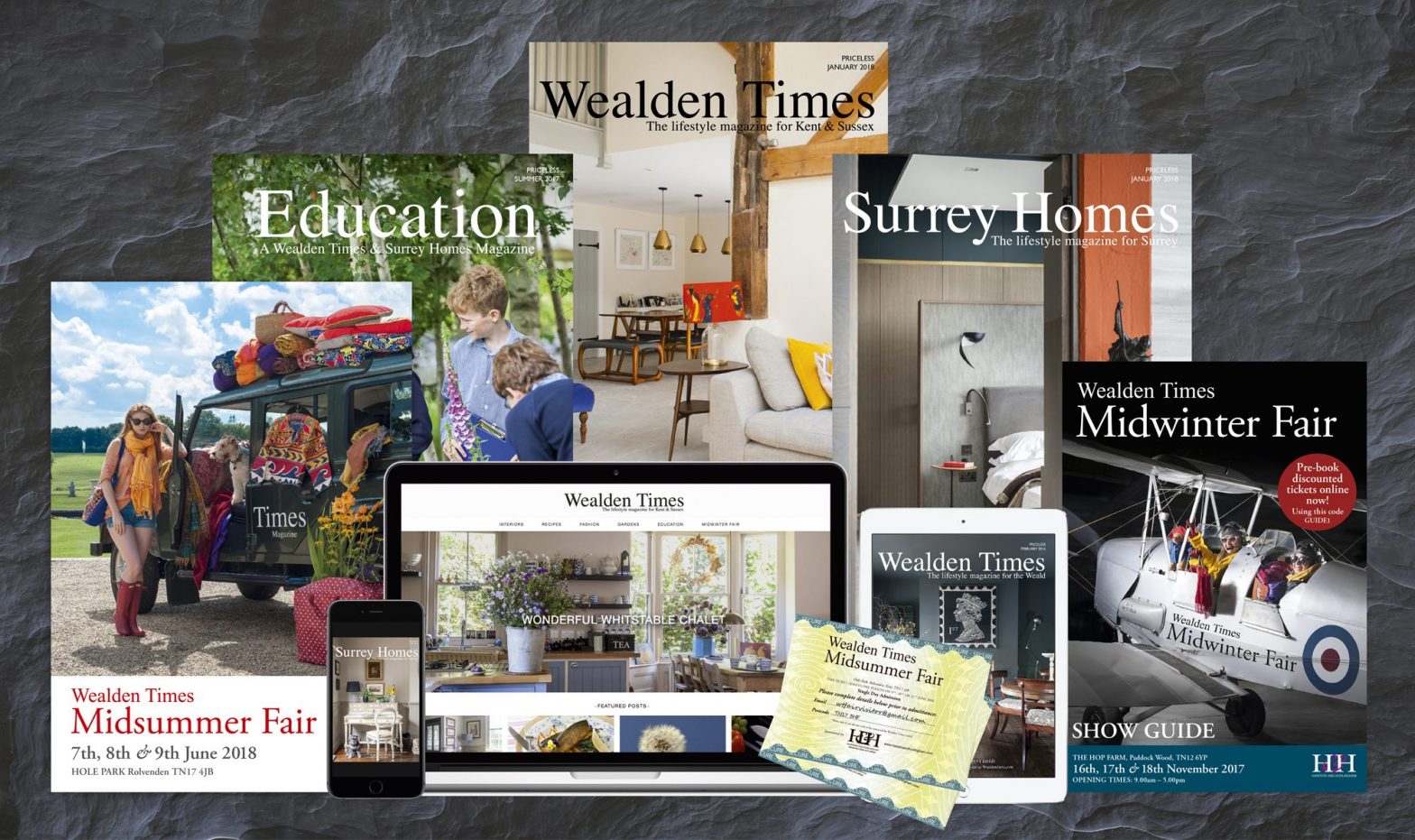 We bring together buyers and sellers and creating the perfect environment for your business to be visible to potential customers… whether it’s marketing through the advertising pages or website of the priceless Wealden Times, Surrey Homes or Education magazines or selling direct to our readers at the Wealden Times Midsummer and Midwinter Fairs, our brands are the perfect way for businesses to connect with the affluent and discerning populations of Kent, Sussex and Surrey.